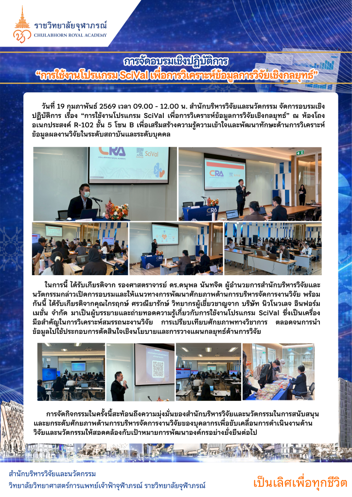 การจัดอบรมเชิงปฏิบัติการ “การใช้งานโปรแกรม SciVal เพื่อการวิเคราะห์ข้อมูลการวิจัยเชิงกลยุทธ์”