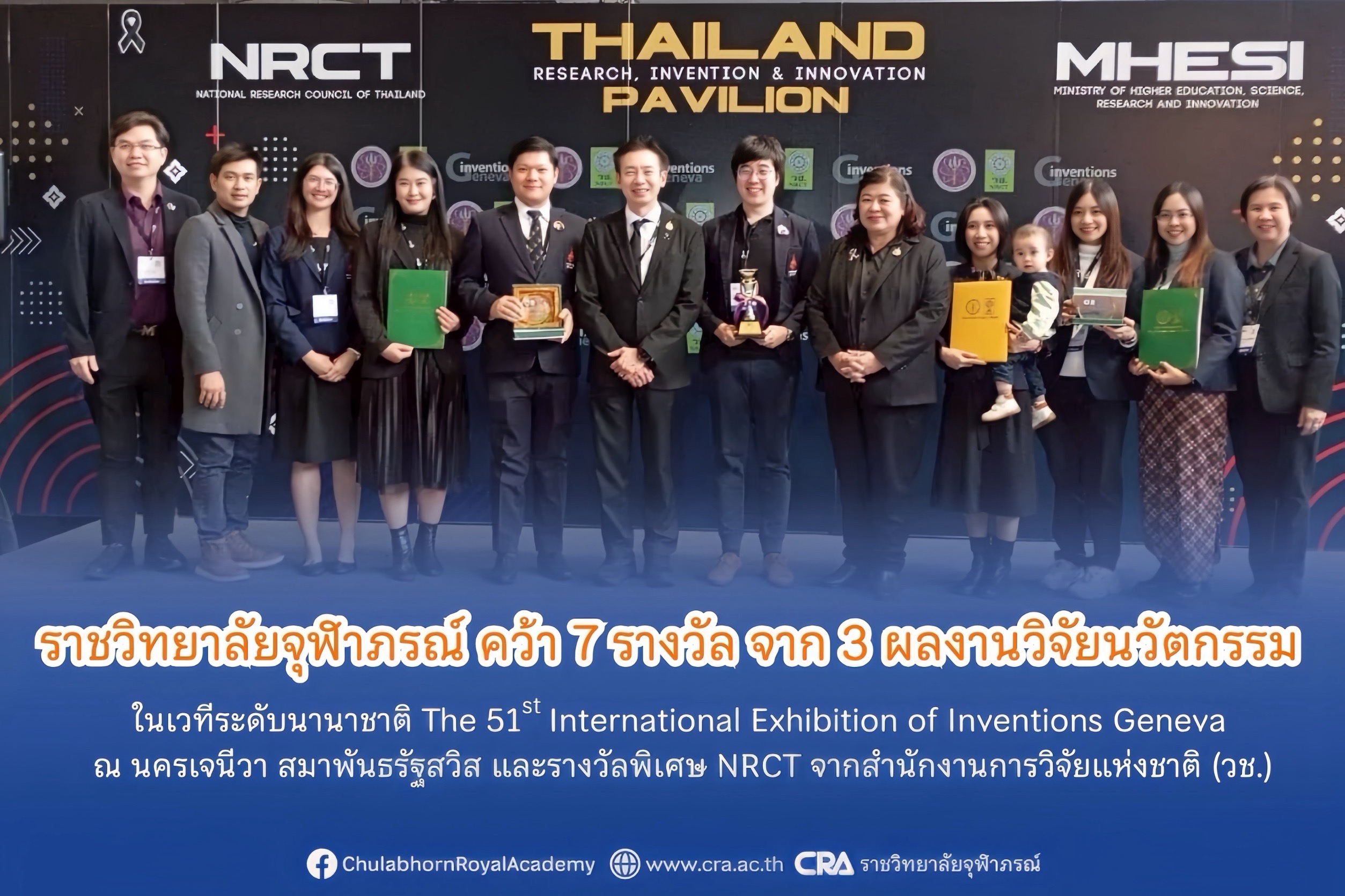 ราชวิทยาลัยจุฬาภรณ์ สร้างชื่อเสียงในระดับนานาชาติ นำคณะนักวิจัยเข้าร่วมประกวดผลงานในเวทีสิ่งประดิษฐ์ที่สำคัญของโลกงาน “The ๕๑st International Exhibition of Inventions Geneva” เมื่อวันที่ ๑๑–๑๕ มีนาคม ๒๕๖๙ ที่ผ่านมา ณ นครเจนีวา สมาพันธรัฐสวิส โดย รัฐบาลสวิตเซอร์แลนด์ ร่วมกับ World Intellectual Property Organization (WIPO) โดยสามารถกวาดรางวัลมาได้ถึง ๗ รางวัล จาก ๓ ผลงานนวัตกรรม ครอบคลุมทั้งด้านเวชสำอาง ปัญญาประดิษฐ์ทางการแพทย์ และเทคโนโลยีการฟื้นฟูสมรรถภาพ