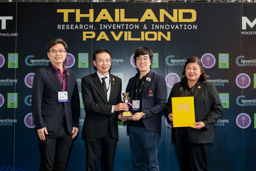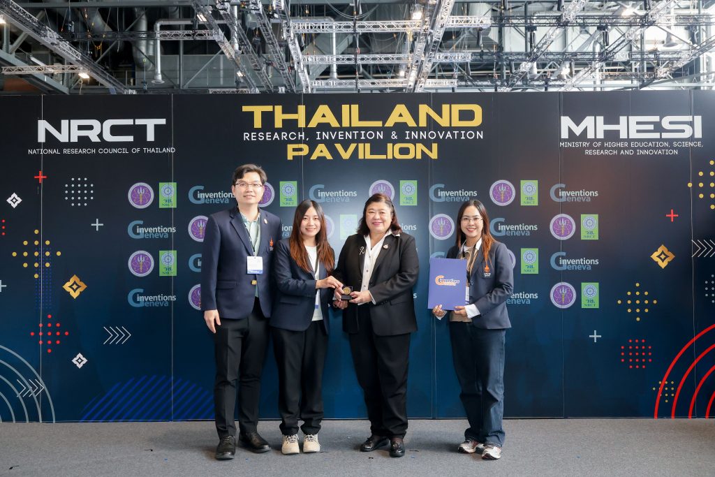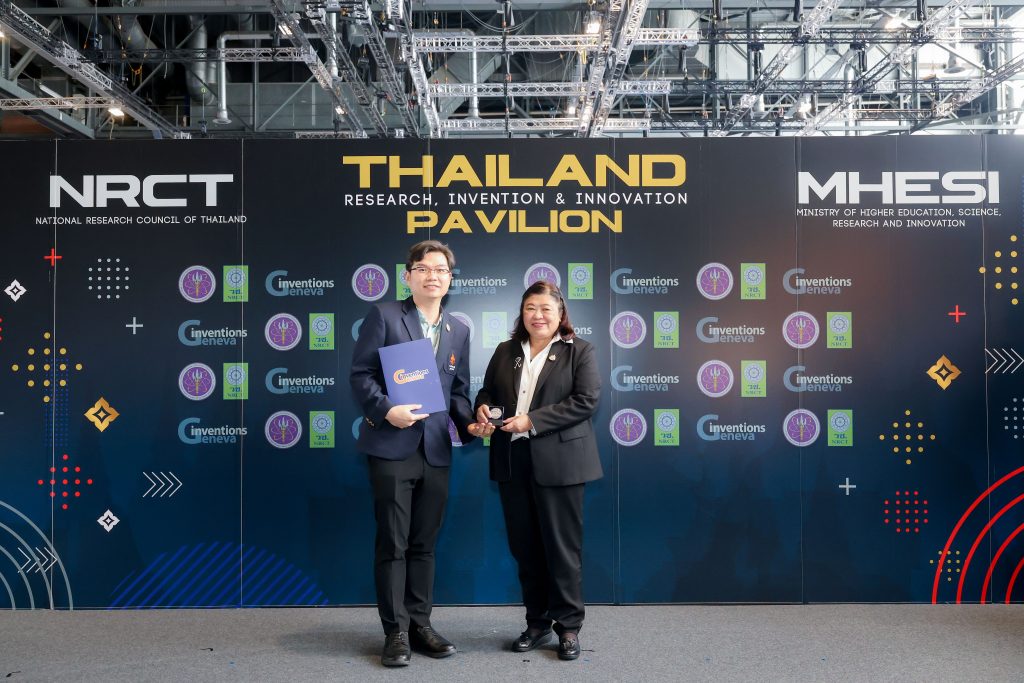๓. นวัตกรรม “Kinec”: คว้ารางวัลเหรียญทองแดง (Bronze Prize) และรางวัลพิเศษ NRCT Honorable Mention Award จาก สำนักงานการวิจัยแห่งชาติ (วช.) เป็นนวัตกรรมฟื้นฟูการเคลื่อนไหวแบบสองข้างสำหรับผู้ป่วยติดเตียง โดยใช้กลไกแรงจากร่างกายผู้ป่วยเองแทนการใช้มอเตอร์ ผสานกับระบบเซนเซอร์และ AI ในการวิเคราะห์การฟื้นตัวของระบบประสาท ช่วยยกระดับคุณภาพชีวิตผู้ป่วยให้กลับมาพึ่งพาตนเองได้ ผลงานโดย ดร.ธันยพร วงศ์วัชรานนท์ , อาจารย์ฉัตรพร เรืองทอง , ดร. อัจฉรียา กสิยะพัท จากคณะเทคโนโลยีวิทยาศาสตร์สุขภาพ ราชวิทยาลัยจุฬาภรณ์ พร้อมด้วย นางสาวชมพูนุท โสธรเทวาพิทักษ์ , นางสาวปณิตรา จันทร์สว่าง และนางสาวกัญญาพร พิมพ์ไธสง นักศึกษาของคณะเทคโนโลยีวิทยาศาสตร์สุขภาพ ราชวิทยาลัยจุฬาภรณ์