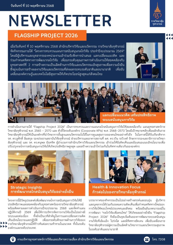 เมื่อวันจันทร์ ที่ 10 พฤศจิกายน 2568 สำนักบริหารวิจัยและนวัตกรรม ราชวิทยาลัยจุฬาภรณ์ จัดกิจกรรมภายใต้ “โครงการทบทวนแผนการสนับสนุนกลไกวิจัย ประจำปีงบประมาณ 2569” โดยมีผู้บริหารและบุคลากรของหน่วยงานเข้าร่วมรับฟังการนำเสนอ แลกเปลี่ยนแนวคิด และร่วมกำหนดทิศทางการพัฒนากลไกวิจัย เพื่อยกระดับคุณภาพการดำเนินงานให้สอดคล้องกับยุทธศาสตร์ที่ 2 การสร้างความเป็นเลิศด้านการวิจัยและนวัตกรรมเชิงสุขภาพเพื่อความยั่งยืน ซึ่งมุ่งเน้นการสร้างผลงานวิจัยและนวัตกรรมที่ส่งผลกระทบระดับชาติและนานาชาติ เพื่อขับเคลื่อนองค์ความรู้และเทคโนโลยีสุขภาพให้เกิดประโยชน์สูงสุดแก่สังคมไทย