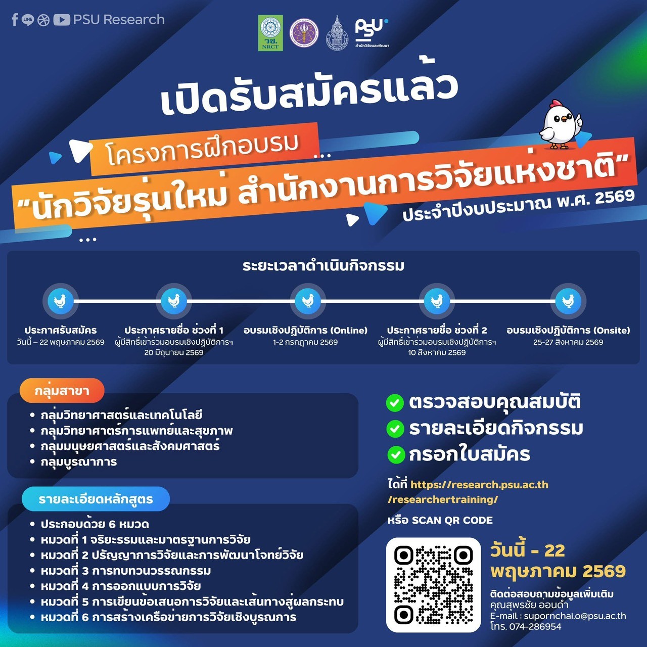 ผู้สนใจสามารถตรวจสอบคุณสมบัติ รายละเอียดกิจกรรม และสมัครเข้าร่วมได้ที่ https://research.psu.ac.th/researchertraining/